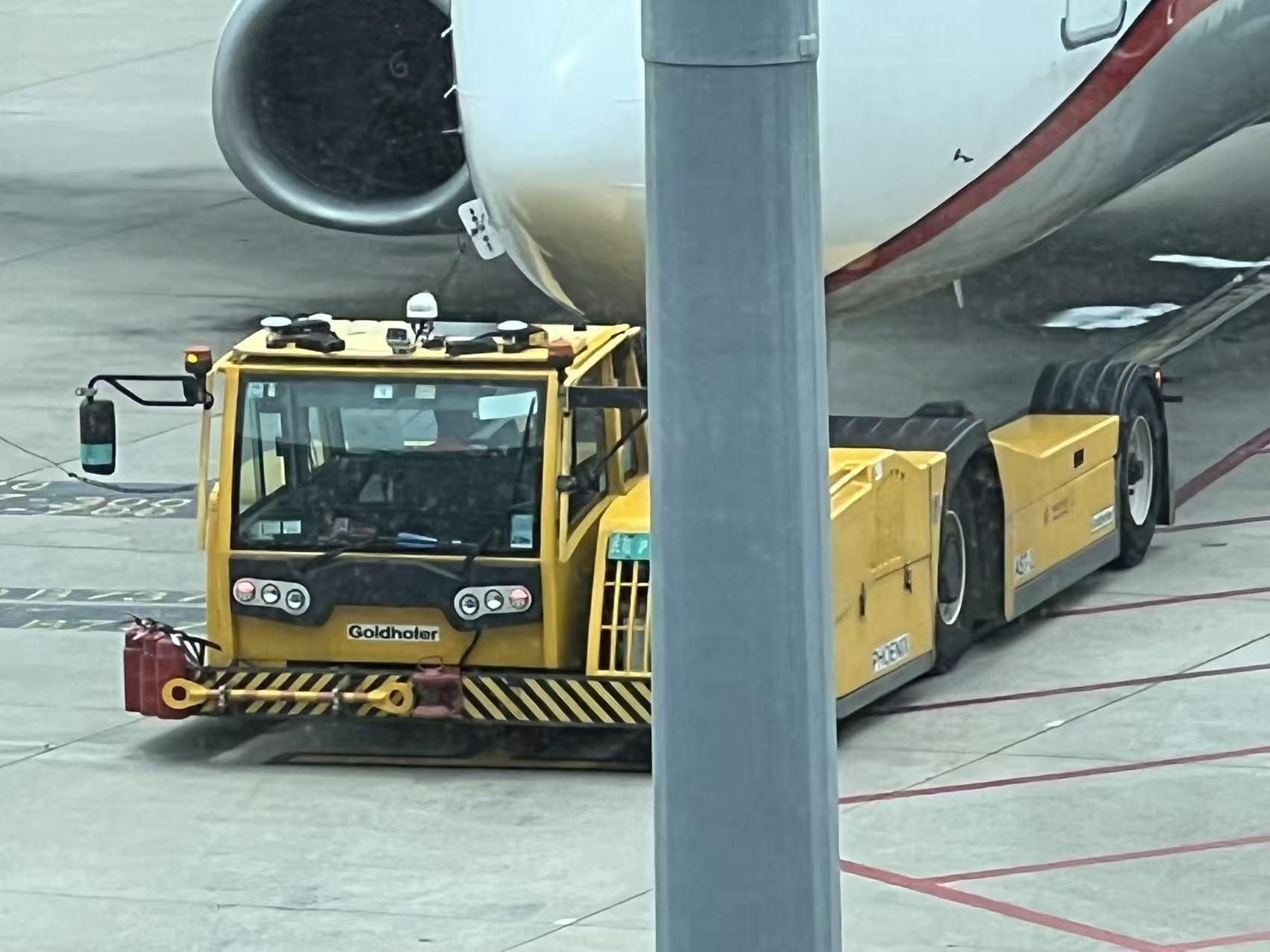 来啦,就是这家公司的产品,把前一个公司收购了。这是Goldhofer的无牵引杆抱轮式拖车,把飞机前轮抱起来,利用飞机前半部分的重量产生对轮胎的压力,以获得抓地力。
